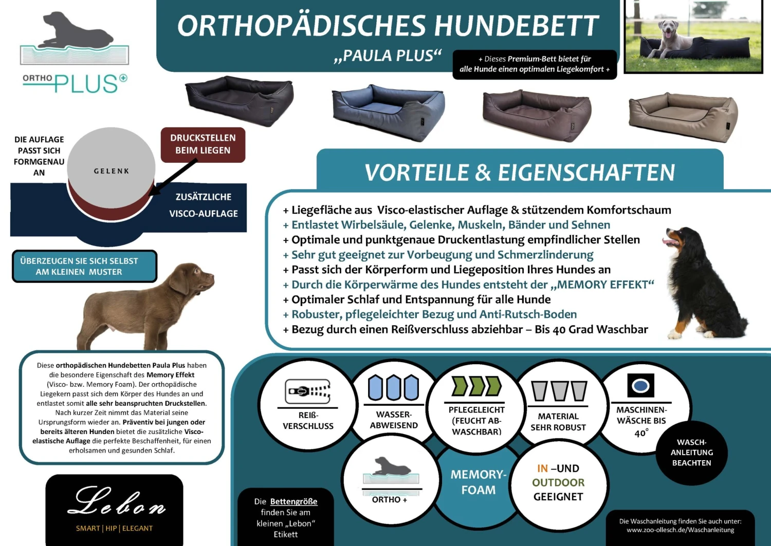 Die orthopädischen Hundebetten Paula Plus haben die besondere Eigenschaft des Memory Effekt (Visco- bzw. Memory Foam). Der orthopädische Liegekern passt sich dem Körper des Hundes an und entlastet somit alle sehr beanspruchten Druckstellen. Nach kurzer Zeit nimmt das Material seine Ursprungsform wieder an. Präventiv bei jungen oder bereits älteren Hunden bietet die zusätzliche Visco-elastische Auflage die perfekte Beschaffenheit, für einen erholsamen und gesunden Schlaf.