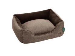 Das beliebte Komfortbett „Ceno“ wird aus dunkelbraunem Kurzhaarplüsch hergestellt und mit Stickereien verziert. Sowohl die Innenseite als auch eine Seite des Wendekissens ist mit beigefarbenem Softplüsch ausgestattet. Die Füllung aus Watte bietet einen besonders angenehmen Liegekomfort. „Ceno“ ist waschbar bis 30°C Handwäsche.