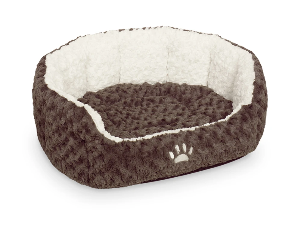 Das ovale Komfortbett „Neiku“ besteht aus besonders weichem Softplüsch (100% Mikrofaser), außen braun, innen weiß, und ist mit einem Wendekissen ausgestattet. Die Füllung aus Watte (Polyester) bietet einen besonders angenehmen Liegekomfort. „Neiku“ ist waschbar bei 30°C Handwäsche.
