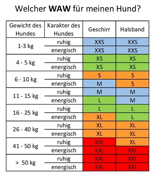 Den WAW gibt es gewichtsabhängig in 7 verschiedenen Größen, die sich der Bewegungskraft entweder mit Tragen eines Halsbandes oder einem Geschirr anpassen lassen. Durch seine Herstellungsweise und den verarbeiteten Materialien hat der WAW eine sehr lange Haltbarkeit und Funktionalität.